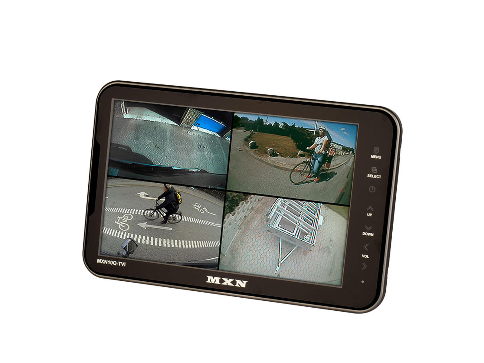 10" Quad-monitor. Monitoren har indgang for fire MXN kameraer og indbygget quadsplitter for visning af op til fire kamerabilleder samtidig, fire trigger-ledninger. Der er indbygget speedswitch.