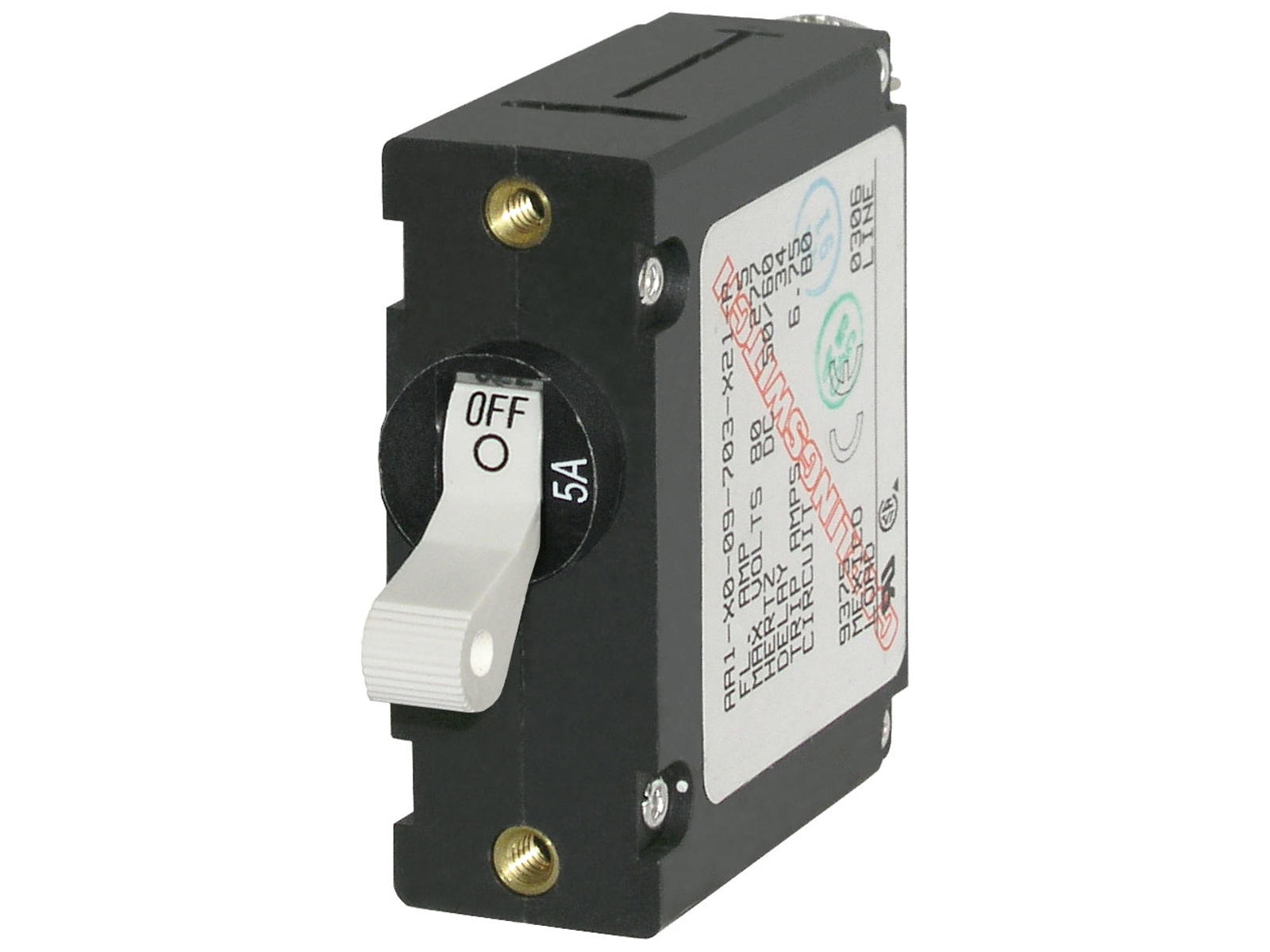 Denne A-Series White Toggle Circuit Breaker er en standard automatsikring, der kombinerer både afbryder- og beskyttelsesfunktion i én enhed. Ideel til brug i elektriske paneler fra Blue Sea Systems.