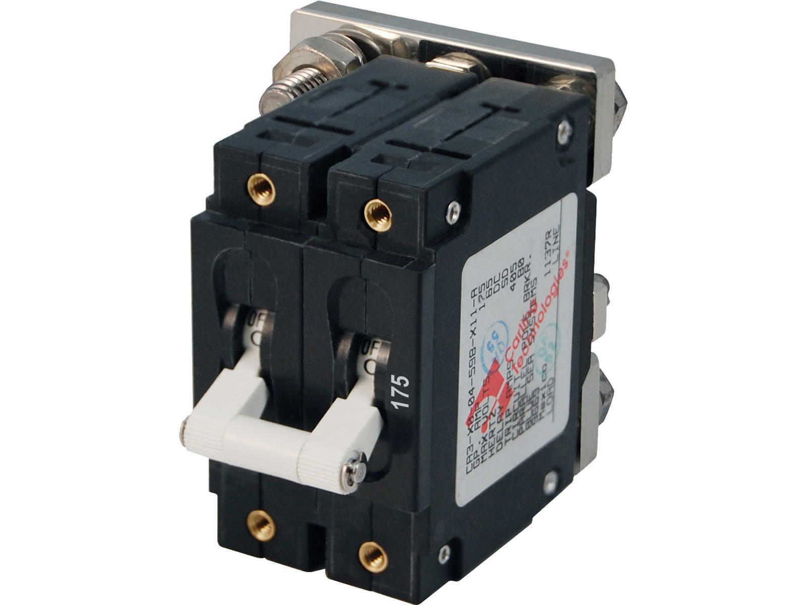 Den C-Series White Toggle Circuit Breaker - Double Pole 175 Amp er en robust, dobbeltpolet sikring designet til at yde maksimal beskyttelse mod overstrøm i kritiske systemer såsom invertere, bovpropeller og ankerspil. Den kombinerer en pålidelig afbryderfunktion med en kraftig sikring for øget sikkerhed.