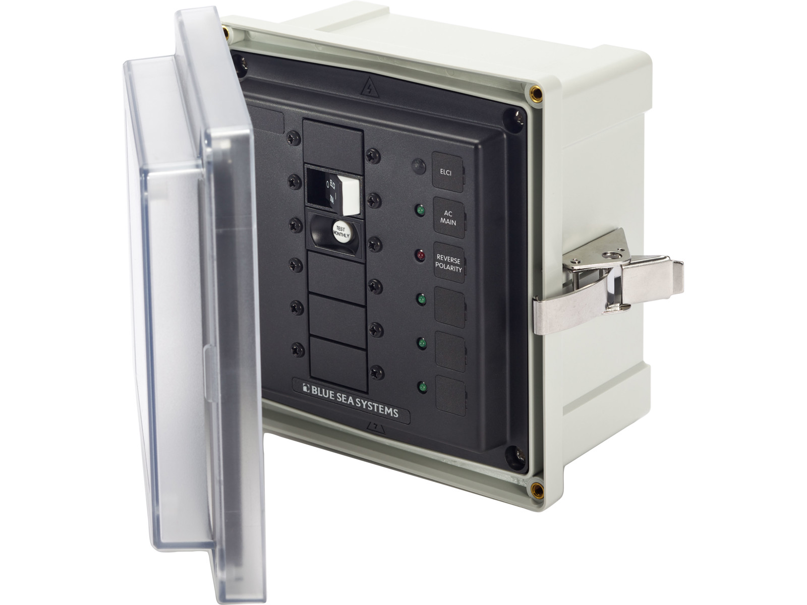 Denne overflademonterede el-tavle er designet til at rumme ELCI Main-kredsløbsafbrydere og andre store enheder. Den opfylder ABYC E-11 kravene, når den anvendes med en ELCI Main-afbryder og monteres inden for 3 meter af en landstrømsindgang.