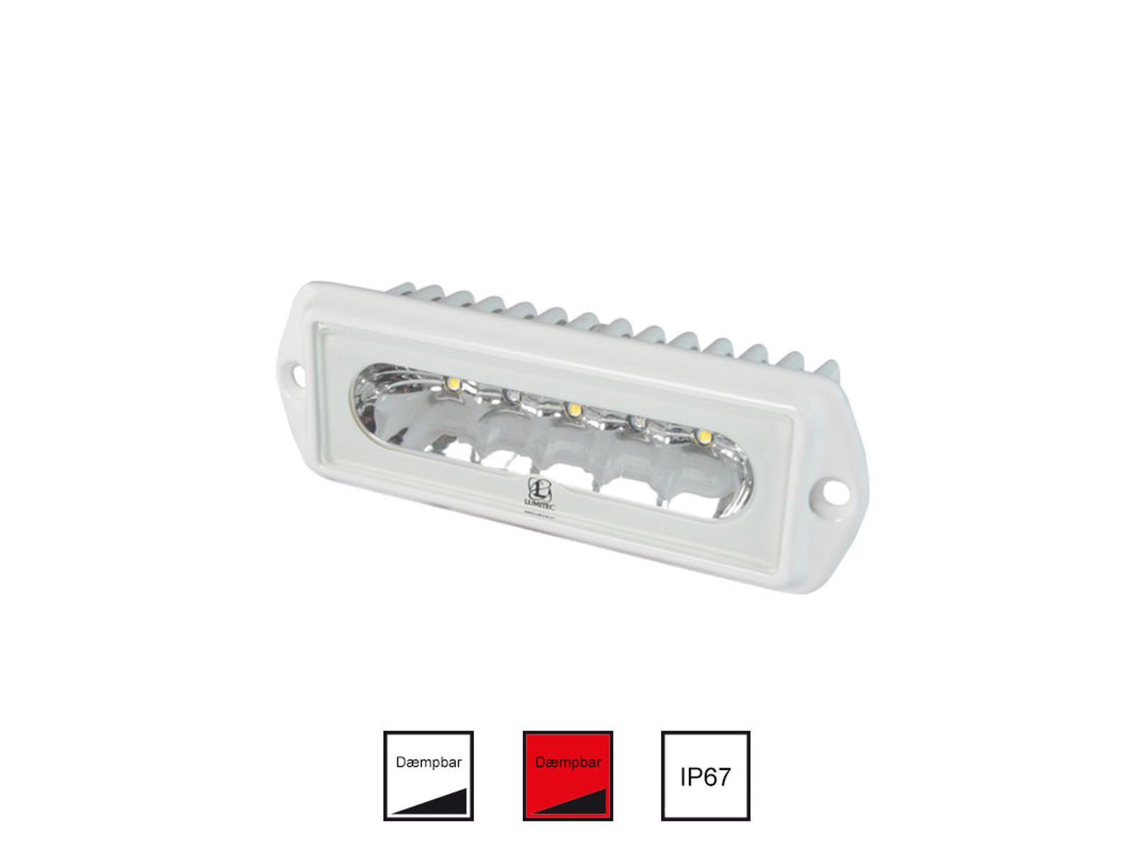 LED-dækslys til montering plant med to rustfri stålskruer. Godt arbejdslys selvom den ikke fylder ret meget. Lyseffekten svarer til 55 watt halogenlys, men forbruger ca. 80 % mindre strøm.