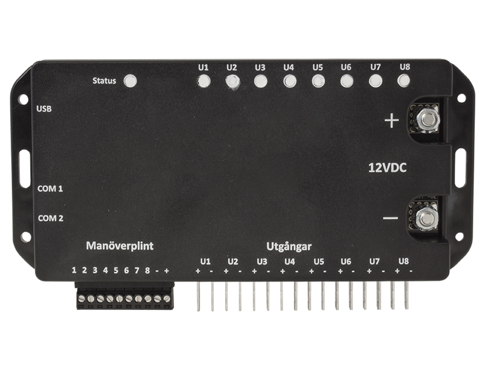 Denne elektroniske 8x relæ-box har 8 udgange/indgange, som kan håndtere op til 25A for hver 2 udgange. Udgangene har strøm- og spændingsovervågning for øjeblikkelig beskyttelse mod kortslutning og overbelastning.