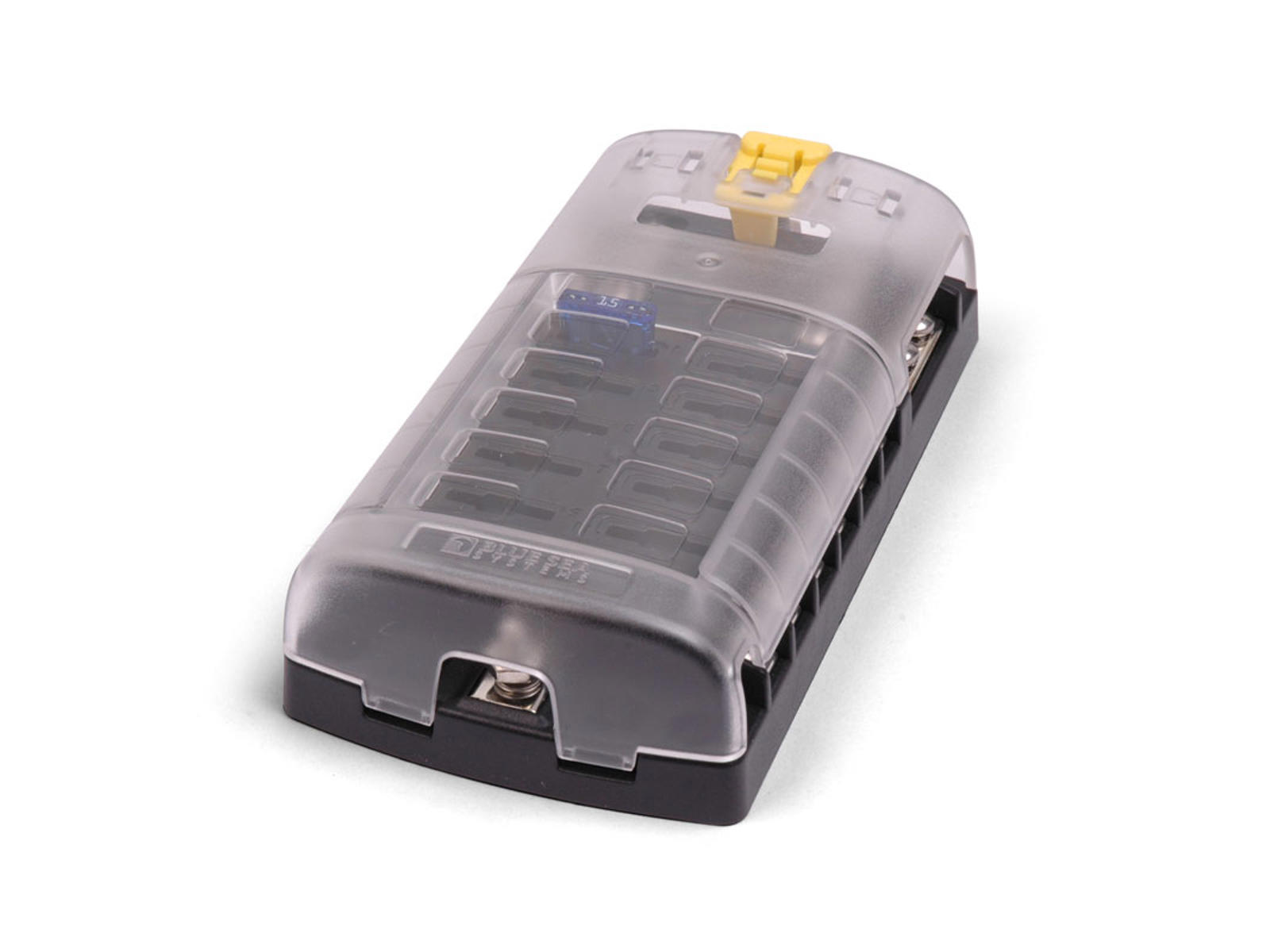ATO sikringsbokse, her med plads til 12 sikringer. Klemme til fælles minus og plads til ekstra sikringer i låget.