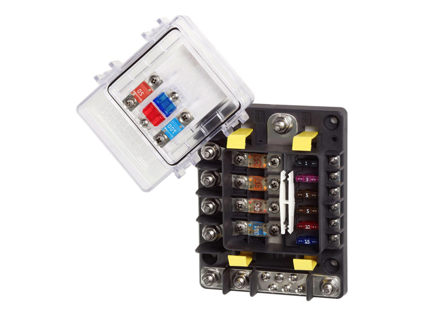 Lækker sikringsboks med plads til fire MIDI sikringer(30-200A) og seks ATO (1-30A) sikringer. Låg med pakning holder sikringer beskyttet.