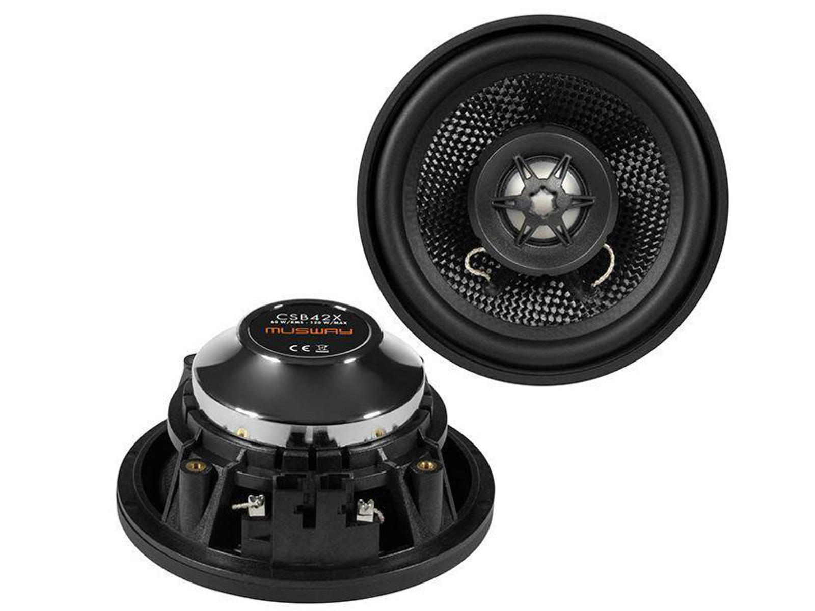 10 cm (4") 2-way coax speaker for BMW E / F / G models / 60 watts / RMS, 120 watts / MAX / Impedance 4 ohms / Frequency range 75 - 22000 Hz / 10 cm midrange, fiberglass cone / Dual neodymium magnet / 20 mm titanium tweeter / Installation depth 43 mm / Installation opening 91 mm / Plug + Play connections