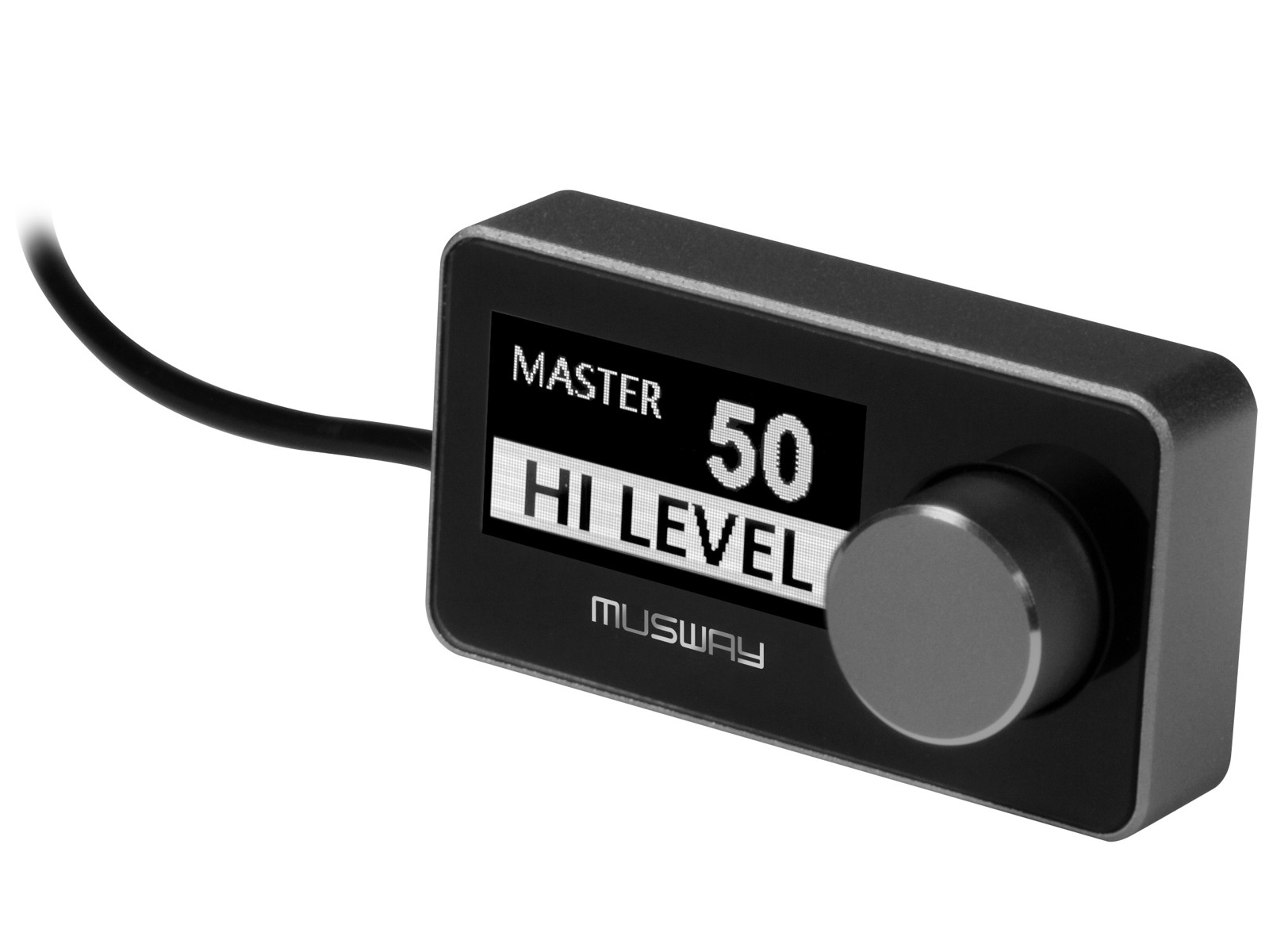 OLED display / Compatible with all MUSWAY DSP models / Supports features like: Master Volume / Subwoofer Level / Source Switching / Recalling the 6 presets / Incl. connection cable, 5 m / Dimensions: 32 x 28 x 60 mm
