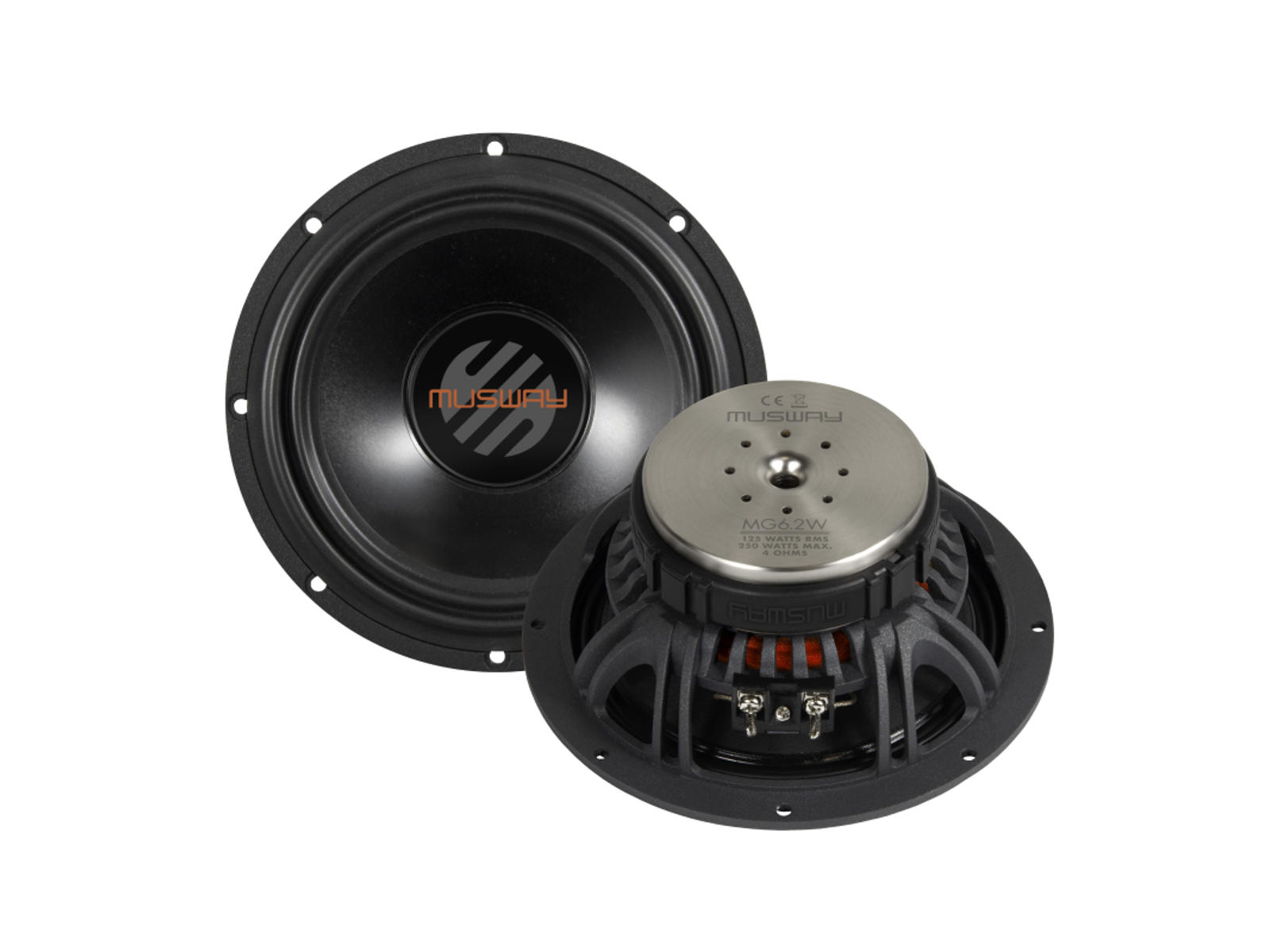 16.5 cm (6.5") Midbass driver / Power Rating RMS 125 Watts / Power Rating Max. 250 Watts / Impedance 4 Ohms / Frequency Range 39 - 5000 Hz / Aluminum-paper Composite Cone / Installation Depth 67 mm / Installation Diameter Ø 143 mm / Outer Diameter Ø 166 mm