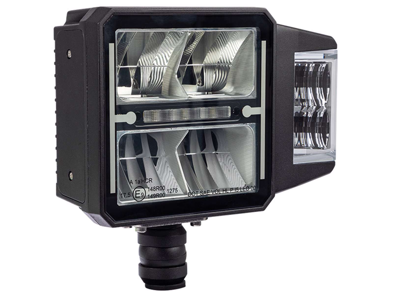 Led kørelys 12/24V, nærlys 24W/1800lm – fjernlys 48W/3600lm, positionslys 3W, blinklys 12W, automatisk opvarmet linse 22W, højde med beslag 176mm, beslagsfastgørelse under huset eller bagsiden.
