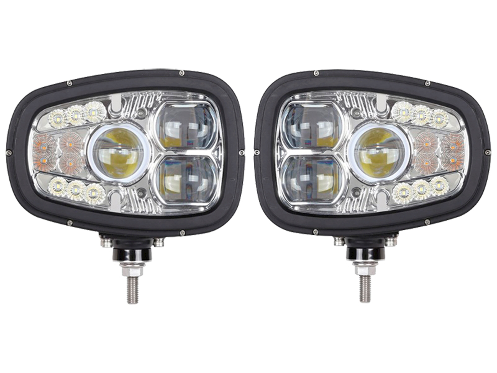 Professionel E24 godkendt LED kombi forlygter i certificeret industrielt design. Som er udstyret med Nærlys, Fjernlys, Blinklys, Positionslys. Derudover har de opvarmning af glasset så sne og is smelter af om vinteren. Glasset er desuden forstærket og dermed modstands dygtig overfor stenslag og falmer ikke med tiden.