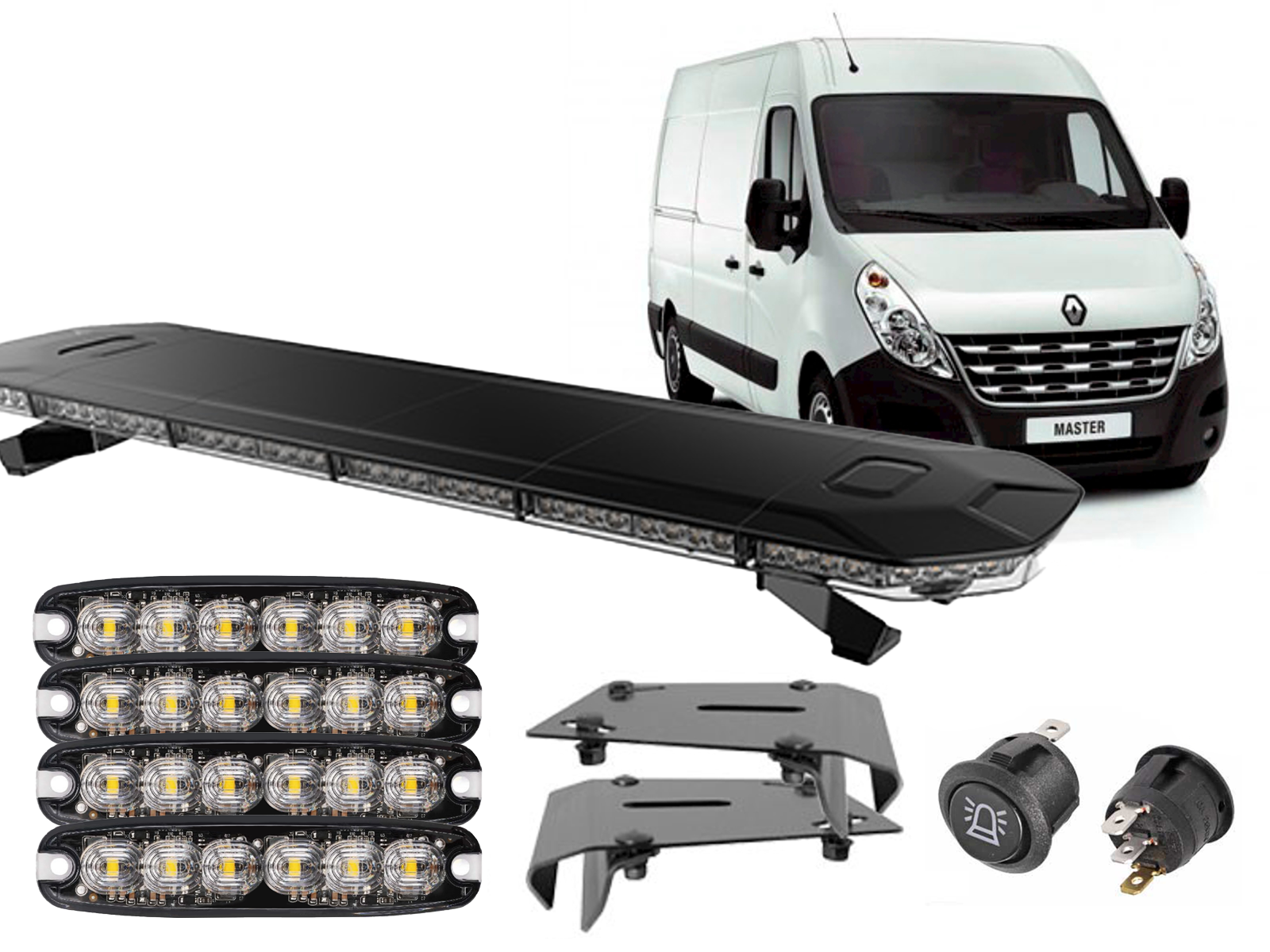 Komplet pakke med vore nye ELENA-serie LED lysbro, 4 stk. af vores kraftige powerflash på 30W med 3 m. ledning, modeltilpasset beslag og en afbryderkontakt.