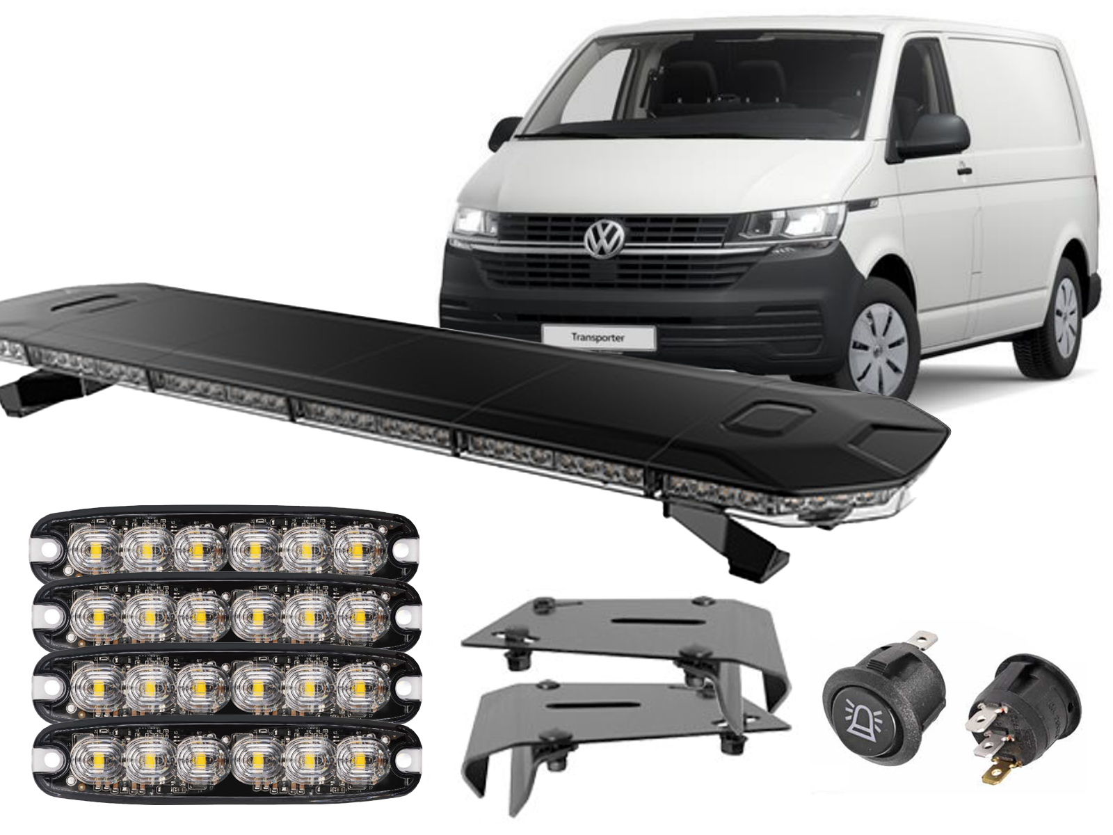 Komplet pakke med vore nye ELENA-serie LED lysbro, 4 stk. af vores kraftige powerflash på 30W med 3 m. ledning, modeltilpasset beslag og en afbryderkontakt.