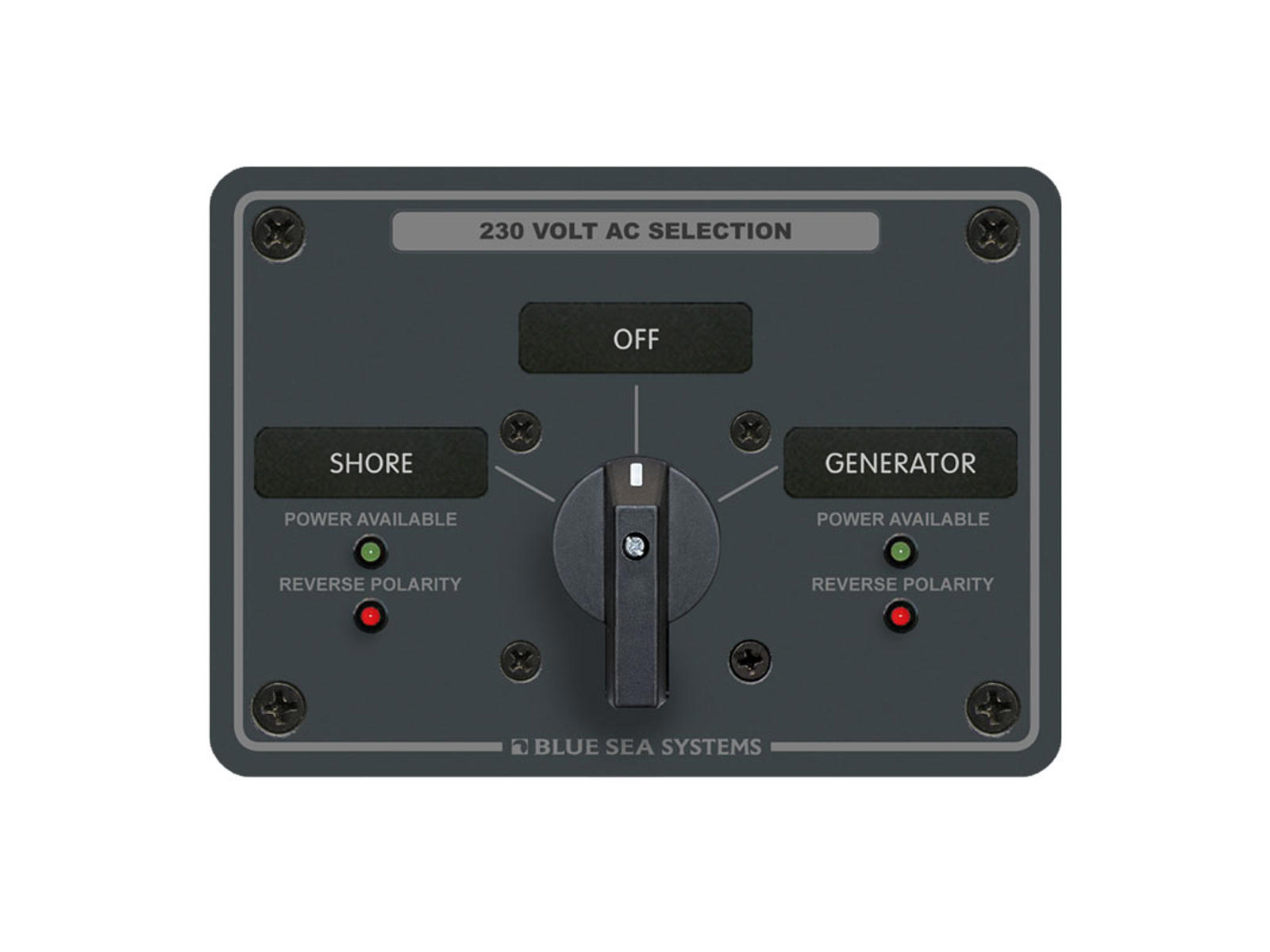 Landstrømsomskifter monteret i panel med LED-indikering.