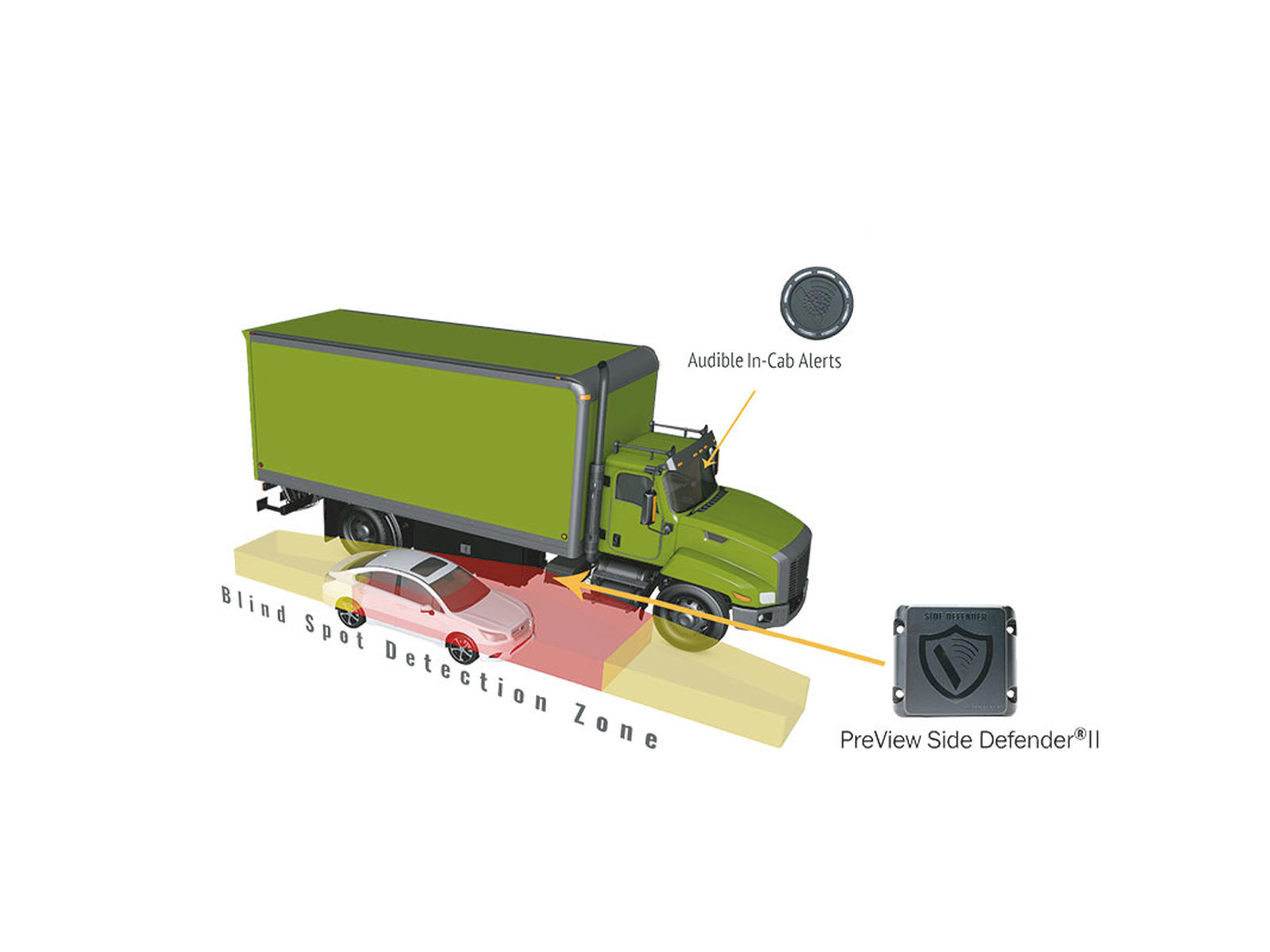 Side Defender®II, systemet advarer aktivt chaufføren med hørbare og visuelle alarmer, så de kan tage de nødvendige forholdsregler for at undgå kollisioner.