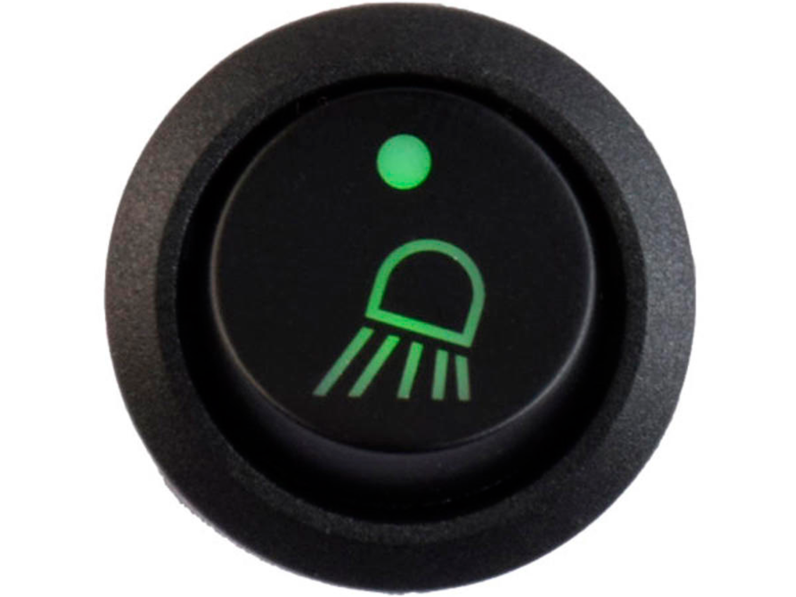 Rund mini afbryder til panelmontering med ARBEJDSLYS symbol og GRØNT indikeringslys