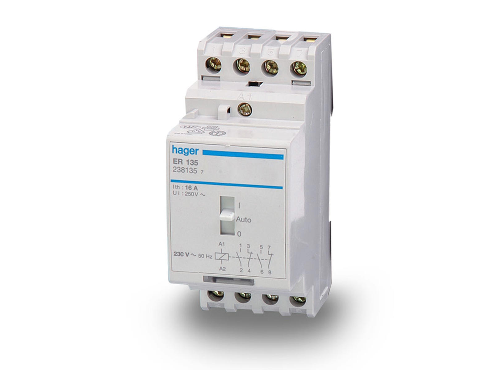 Med Hager's relæ kan omskiftningen ske automatisk mellem stikkontat og inverter. Monteres i tavle på DIN skinne. Spænding: 230 volt Maksimal strøm: 16 amp