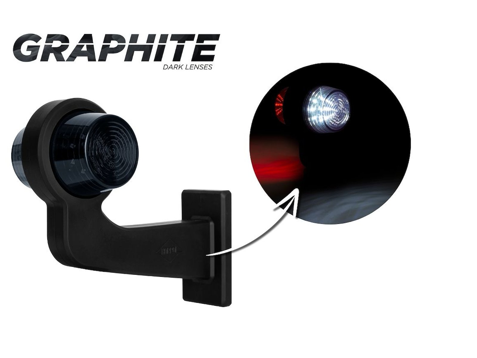 LD 2586/GRAPHITE er en hvid og rød markeringslygte på en lang arm, designet til montering på venstre side af et køretøj. Velegnet til alt fra små trailere til lastbiler og sættevogne.