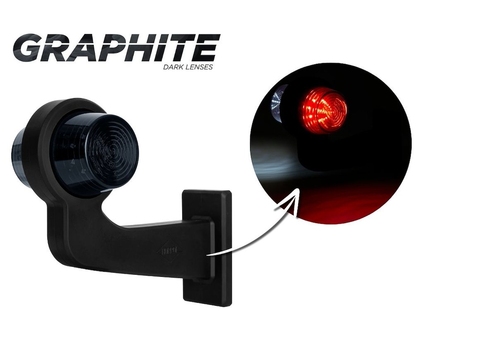 LD 2587/GRAPHITE er en hvid og rød markeringslygte på en lang arm, designet til montering på højre side af et køretøj. Velegnet til alt fra små trailere til lastbiler og sættevogne.