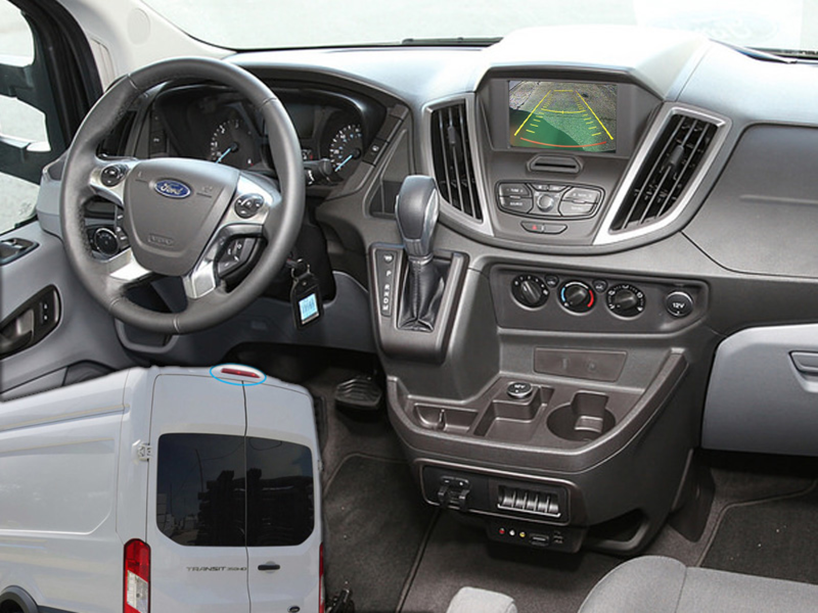 Passer til Ford Transit 2015-2019 (ikke til Transit med delte bagdøre eller høj model) !! OBS !! Bilen skal have følgende originalskærm for at systemet understøttes: Sync 1 - 5" monitor FORD NAV MFD LOW