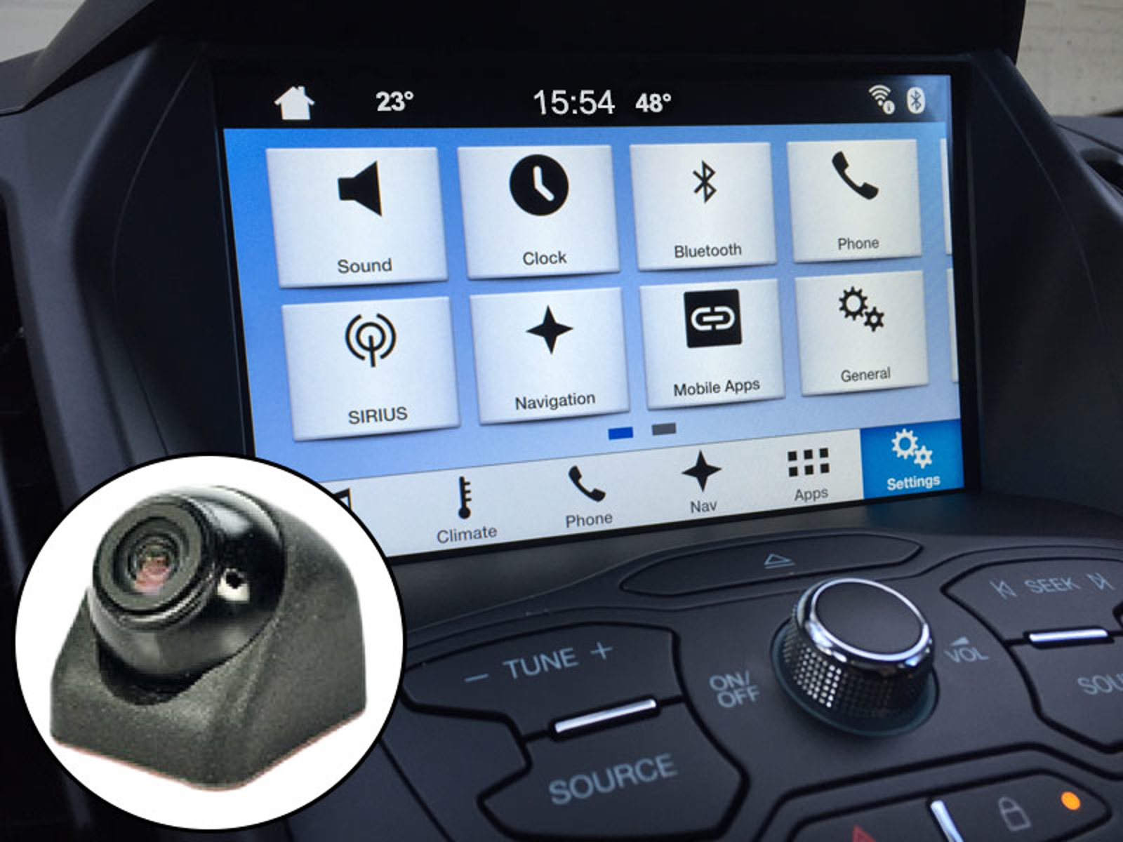 Integreret mikro-bakkamera i knivskarp kvalitet på den originale Ford Sync2 og Sync3 skærm