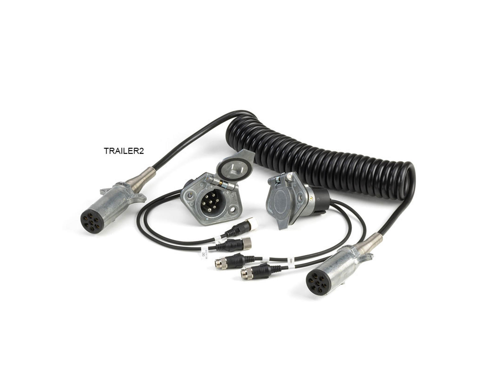 Trailersæt der forbinder kameraer fra traileren til monitoren i forvognen. Lavet med store professionelle stik, aflastninger og kabelforbindelser. Kamerakablerne er 4-polede (MXN) og i vandtæt udførelse.