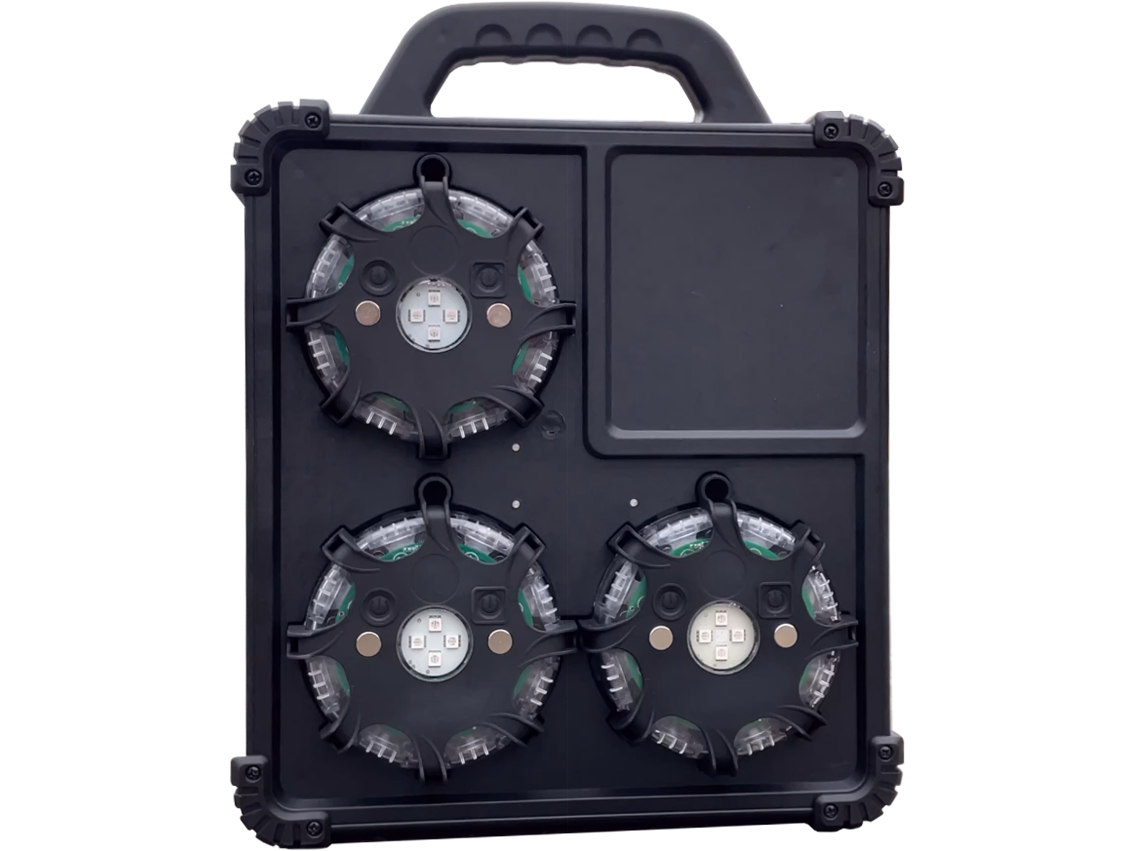 Smart håndholdt advarselslys-kuffert med 6 stk. LED advarsel-pucks (LED skildpadder) med kraftig flash. Kufferten fungerer som magnetisk ladestation, med 3 stk. puck på hver side. De 6 LED pucks (LED skildpadder) har automatisk tænd funktion med synkronisering. De kan indstilles til blå, rød eller gult lys.