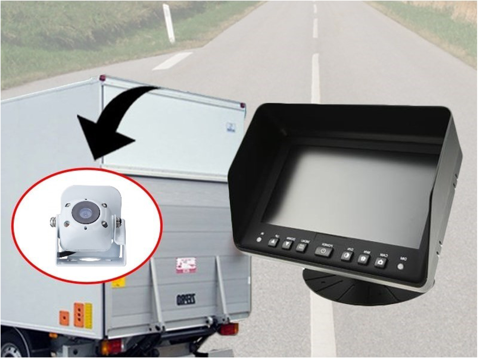 Farvemonitor 16:9 med indbygget styring af 2 kameraer. Nem plug'n play montering, PAL/NTSC (auto), mirror/normal, Justerbar guidelines. DC 12/24VKamera i et super smart og diskret design. Designet specielt for alukasse varebiler.